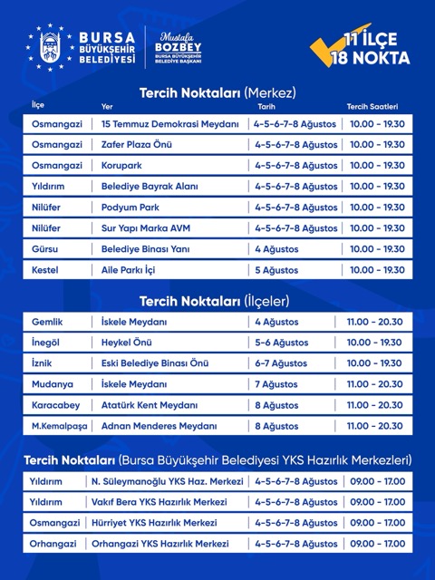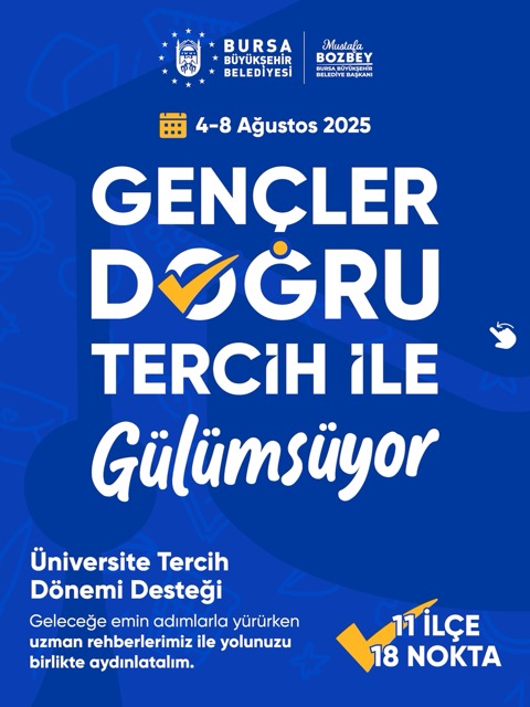 BURSA – Bursa’da eğitimden sanata, spordan kültüre kadar her alanda gençleri destekleyen Bursa Büyükşehir Belediyesi, üniversite sınavına girenlerin en doğru tercihi yapabilmesi için 11 ilçede oluşturulacak 18 farklı noktada ücretsiz danışmanlık desteği verecek.